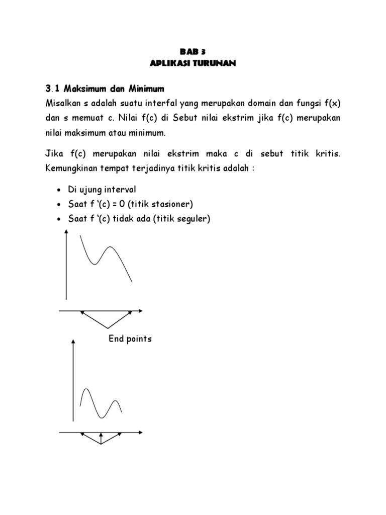 Turunan di titik ekstrim lokal Misal fungsi kontinu pada selang terbuka 𝐼 yang memuat. Dan dinamakan titik maksimum mutlak dari fungsi pada selang. Telah kita ketahui bahwa titik kritis x3.