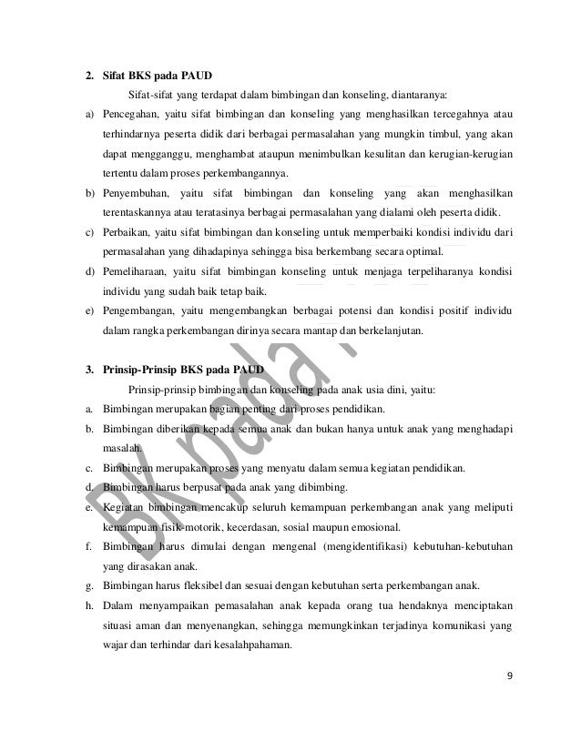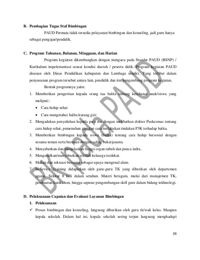 Membuat data berbentuk laporan dari hasil wawancara dan observasi untuk. Bimbingan konseling anak usia dini bukan hanya penting dalam memberikan wawasan dan pencerahan bagi mahasiswa dan pendidik namun diharapkan dapat memberikan layanan bimbingan yang tepat dalam rangka menumbuh- kembangkan potensi anak PAUD secara optimal. 40 mengartikan bimbingan sebagai a process of helping an individual to understand himself and his world yang artinya proses pemberian bantuan kepada individu agar mampu memahami diri dan.