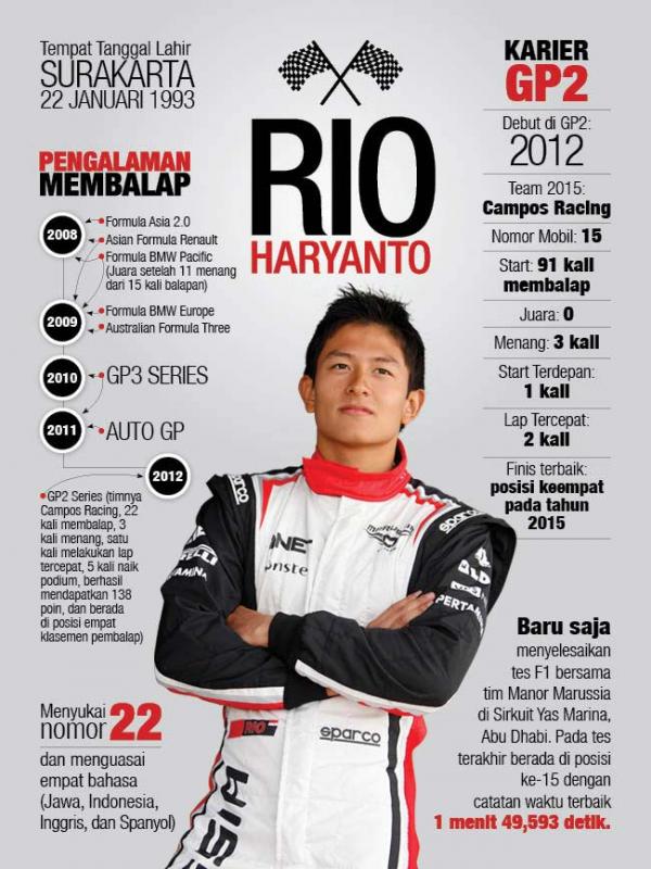 InfoBiografiCom Rio Haryanto merupakan pembalap Indonesia yang membalap di ajang formula satu F1 bersama tim Manor Racing. Struggling Debut For The Indonesian First F1 Driver Racing For Manor Racing Team - Mercedes at Monte Carlo. Having started karting at the age of six by 2008 Haryanto had moved into racing cars in the Asian Formula Renault.