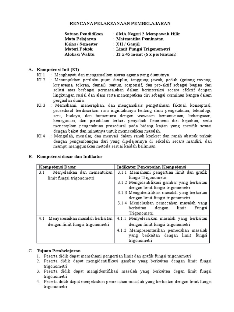 Selama dan setelah mengikuti proses pembelajaran ini peserta didik diharapkan dapat. RENCANA PELAKSANAAN PEMBELAJARAN RPP Sekolah. 31 Menjelaskan dan menentukan limit fungsi trigonometri 41 Menyelesaikan masalah berkaitan dengan limit fungsi trigonometri 32 Menjelaskan dan menentukan limit di ketakhinggaan fungsi aljabar dan fungsi trigonometri 42 Menyelesaikan masalah berkaitan dengan eksistensi limit di ketak-hinggaan fungsi aljabar dan fungsi trigonometri.