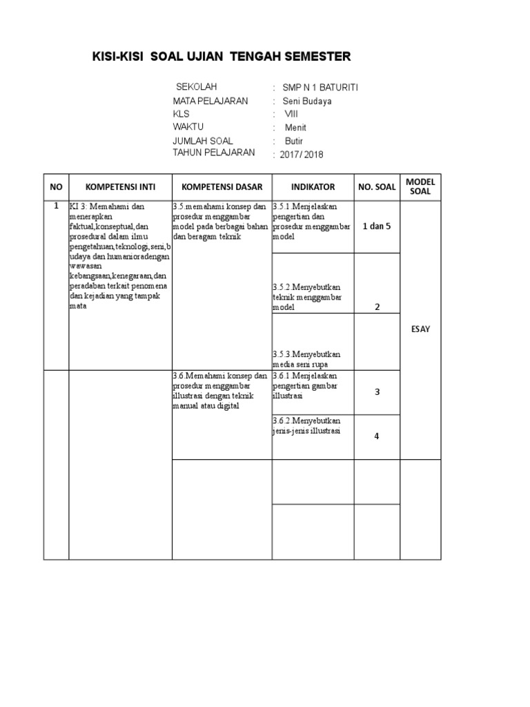 Soal uts esai seni budaya kelas 8 semester 1 2017. Kerjakan dulu soal yang kamu anggap mudah. Soal PTS UTS Seni Budaya Kelas 8 Semester 2 SMP MTs Terbaru merupakan Kumpulan Soal UTSPTS Seni Budaya Kurikulum 2013 Kelas 8 Semester 2 Revisi Terbaru yang dapat digunakan oleh rekan pendidik yang. Soal Seni Budaya Kelas 8 - Gambar hiasan yang dibuat di atas kain yang teknik pengerjaannya melalui proses penutupan dengan bahan lilin dan menggunakan Orang yang ahli dalam membuat lukisan adalah.