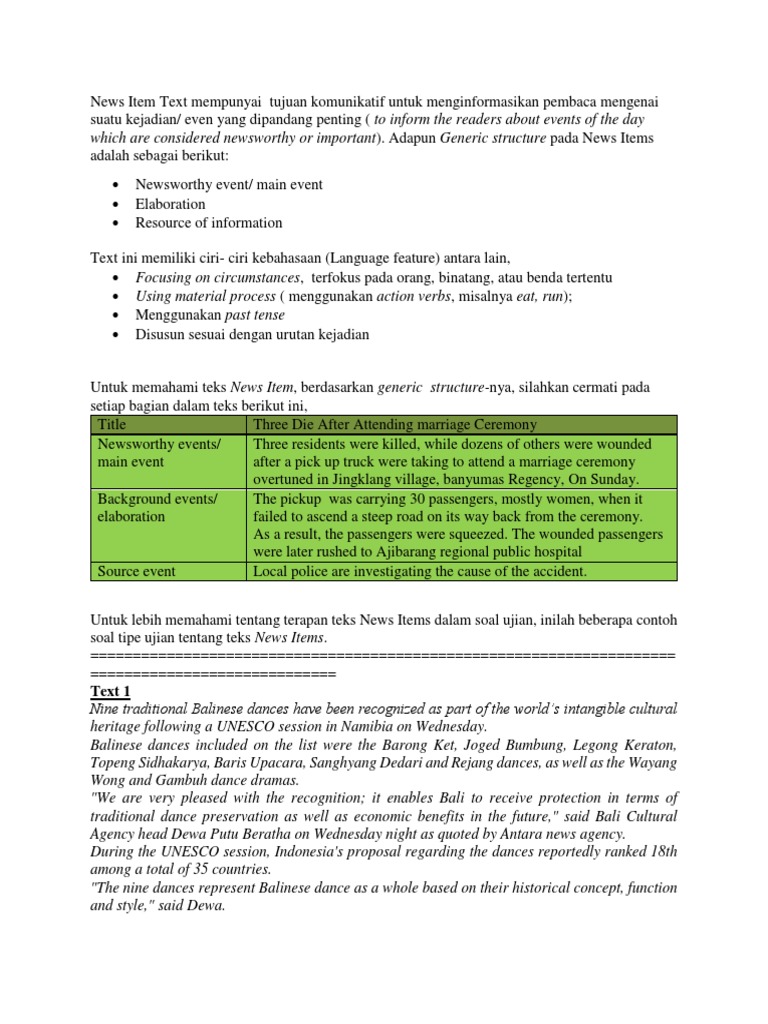 Contoh soal news item text. 6 Contoh News Item text dan Artinya Terupdate News item adalah teks yang memberikan informasi tentang kejadian peristiwa harian. Ya potongan berita ini adalah jenis teks yang cukup sering dikeluarkan dalam berbagi ujian bahasa Inggris. Contoh Soal tentang News Item Text ANCIENT ARTIFACT TO BE RETURNED TO INDONESIA Sanggurah Stone or more commonly the Minto stone is expected to be returned to its home in Indonesia from Scotland.